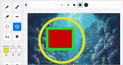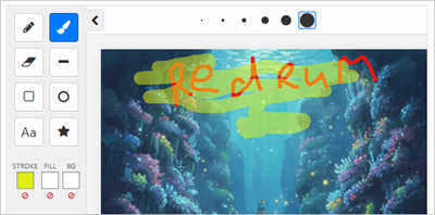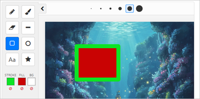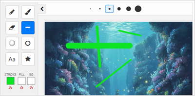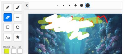 The drawing tools live in a collapsible panel on the left side of the whiteboard. Some of the tools have further options (pen sizes and font details and stamps) which are displayed in the top bar of the whiteboard.